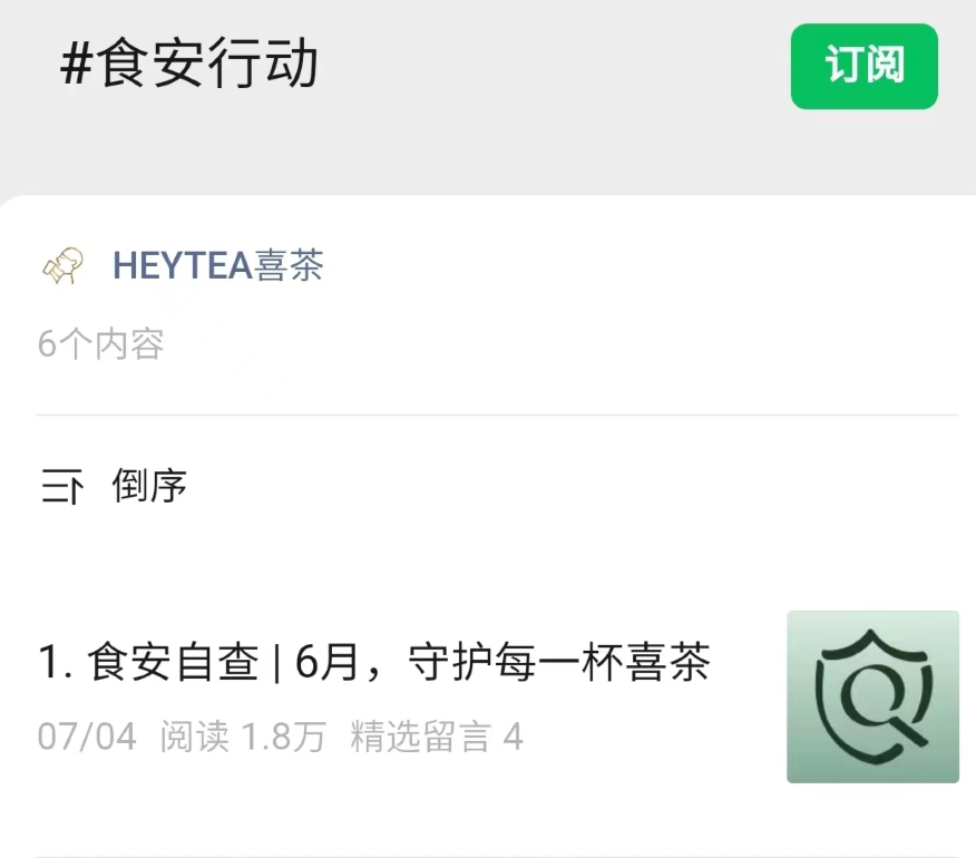 喜茶從2020年5月,第一次正式對外公布自檢工作情況,其在官方微信公眾號中表示,喜茶將食品安全視為生命線,在每一個看得見與看不見的環(huán)節(jié),做好食品安全的層層把關(guān),極致食安一直在行動。