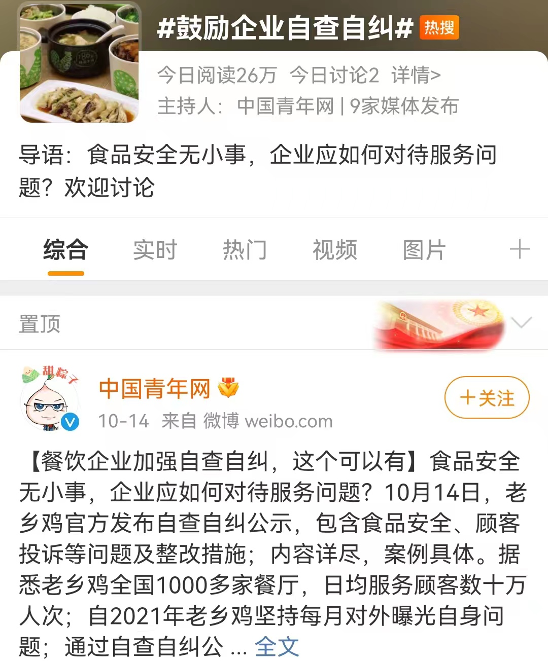 起因是10月13日,整天“咯咯噠”的老鄉(xiāng)雞下場“自曝家丑”。其官方賬號在微博、微信平臺發(fā)布了最新的食安自查自糾報告。