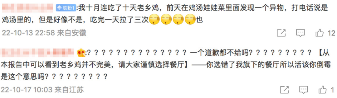 紅藍(lán)雙方各執(zhí)己見,評論區(qū)一會“頂呱呱”,一會“苦哈哈”,在各路消費(fèi)者的加速曝光下,老鄉(xiāng)雞的食安問題愈演愈烈。