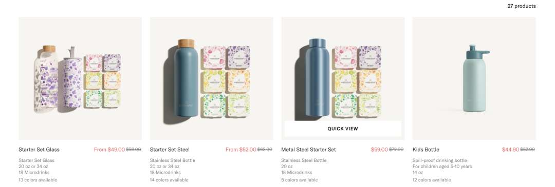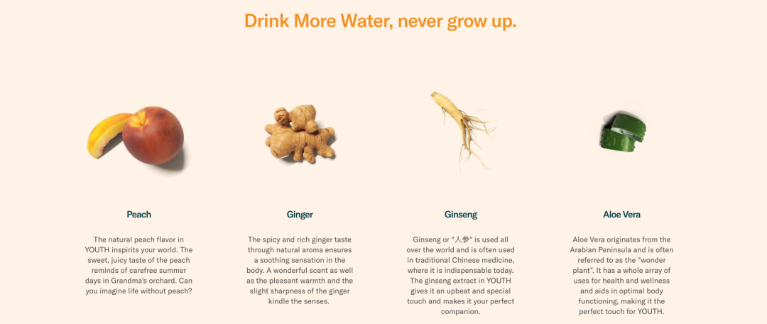 Waterdrop的產(chǎn)品線主要包括兩類產(chǎn)品:無糖小方塊(Microdrink)和飲水器具(Drinkware)。無糖小方塊主要以盒裝形式出售,一盒包括12顆方塊。Waterdrop還專門為無糖方塊產(chǎn)品線設(shè)置了兩款細(xì)分產(chǎn)品——無糖方塊飲和無糖方塊茶。其中,無糖方塊飲包含14種口味,成分主要包括14種不同的植物,并且不同的植物成分對應(yīng)不同營養(yǎng)功效的方塊。比如YOUTH系列方塊則主要由青春抗老的維生素(維生素C、B2、B3)和養(yǎng)生植物(人參、蘆薈、桃、生姜)組成。