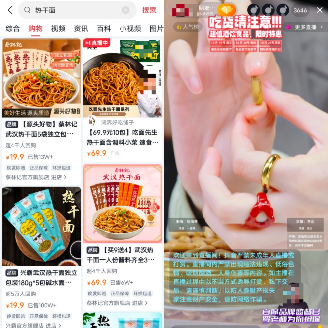 隨后,抖音直播迅速地融入今日頭條App中。根據(jù)Tech星球體驗(yàn),用戶在首頁的信息流推薦中,一般每瀏覽5至6個圖文內(nèi)容,就會出現(xiàn)一個直播入口,直播的曝光頻次大幅提升。更重要的是,當(dāng)前推薦的直播內(nèi)容主要以電商內(nèi)容為主,比如直播帶貨,用戶可以像在抖音直播間那樣,在今日頭條的直播間內(nèi)購物。