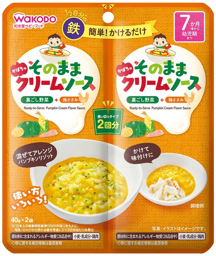 如日本專業(yè)嬰幼兒食品品牌和光堂的奶油南瓜調(diào)味醬,含有三種蔬菜,來源于雞肉的優(yōu)質(zhì)蛋白質(zhì)及豐富的鐵元素,只需要將醬汁和其他食材混合起來簡單加熱,就能制作出美味又營養(yǎng)的嬰幼兒輔食。且獨立小包裝方便控制用量,省時省力,大大減輕了寶媽制作輔食的工作量。