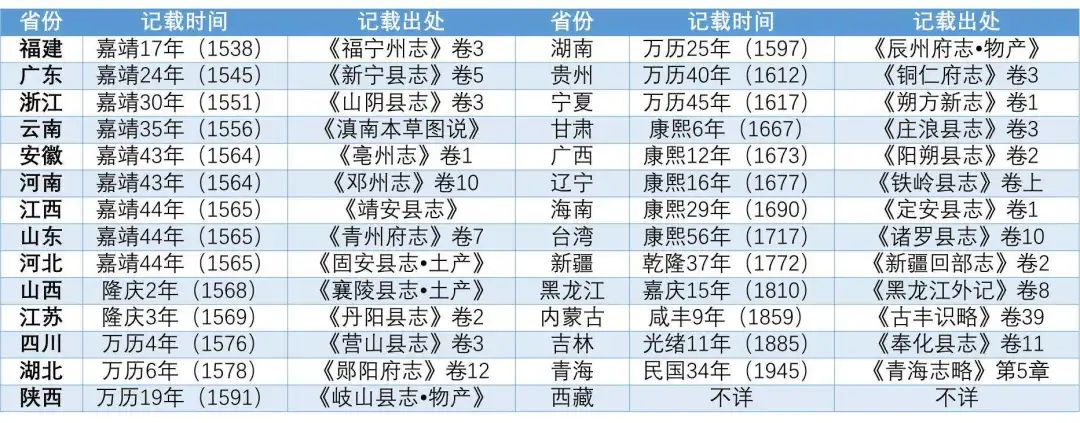 各省記載南瓜最早時間出處一覽表,圖片來源:知識分子