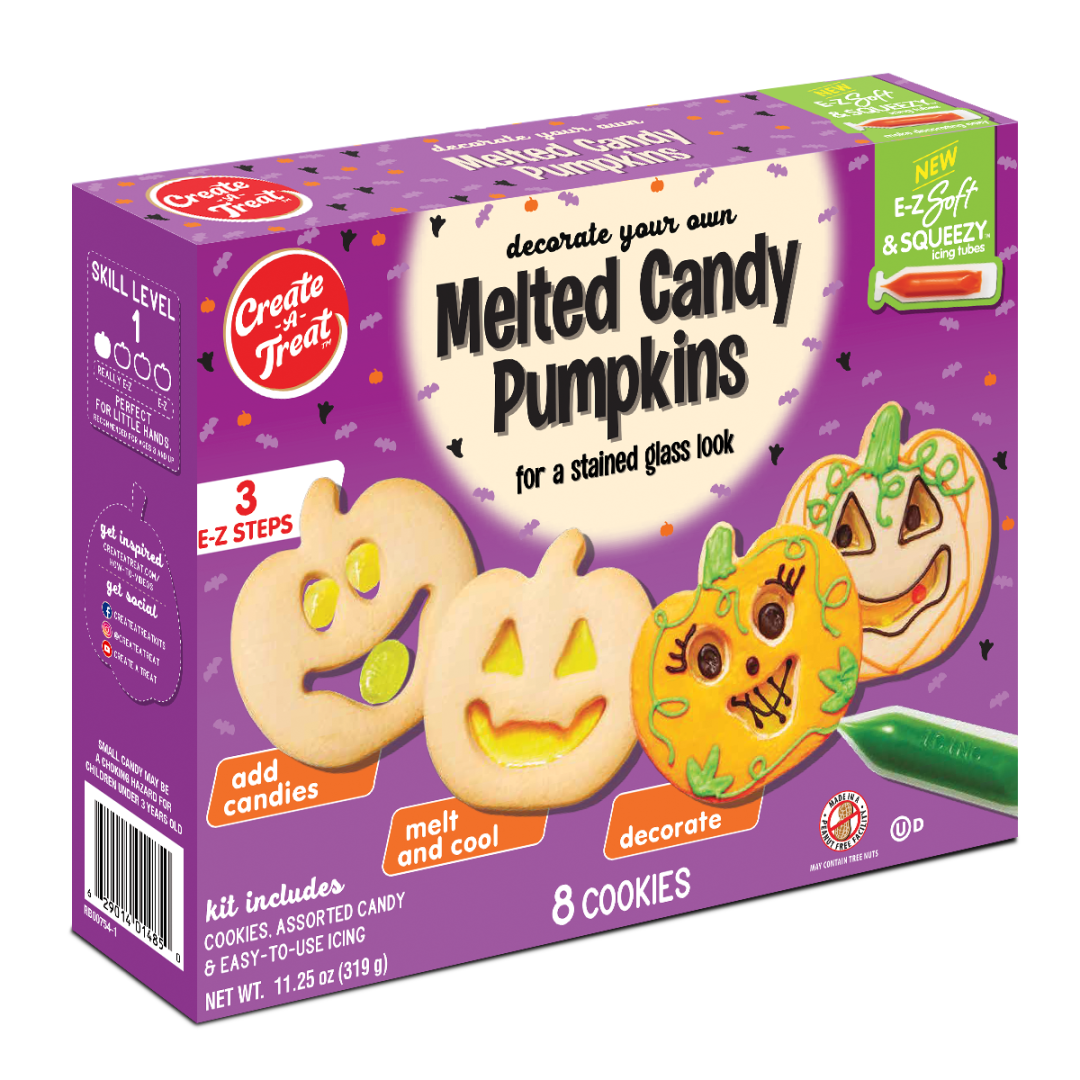 除了常規(guī)的南瓜燈籠形狀的產(chǎn)品之外,加拿大公司Create A Treat還推出了更有可玩性的萬圣節(jié)DIY餅干套裝,里面含有8塊預(yù)烤南瓜形曲奇,裝飾用糖霜和糖果。