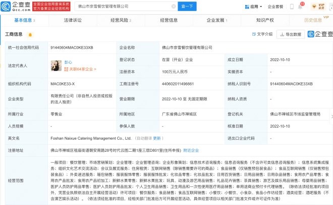 企查查APP顯示,10月10日,佛山市奈雪餐飲管理有限公司成立,法定代表人為彭心,注冊(cè)資本100萬元人民幣,經(jīng)營范圍包含:餐飲管理;食品互聯(lián)網(wǎng)銷售;小餐飲;小餐飲、小食雜、食品小作坊經(jīng)營;酒類經(jīng)營;酒吧服務(wù)等。
