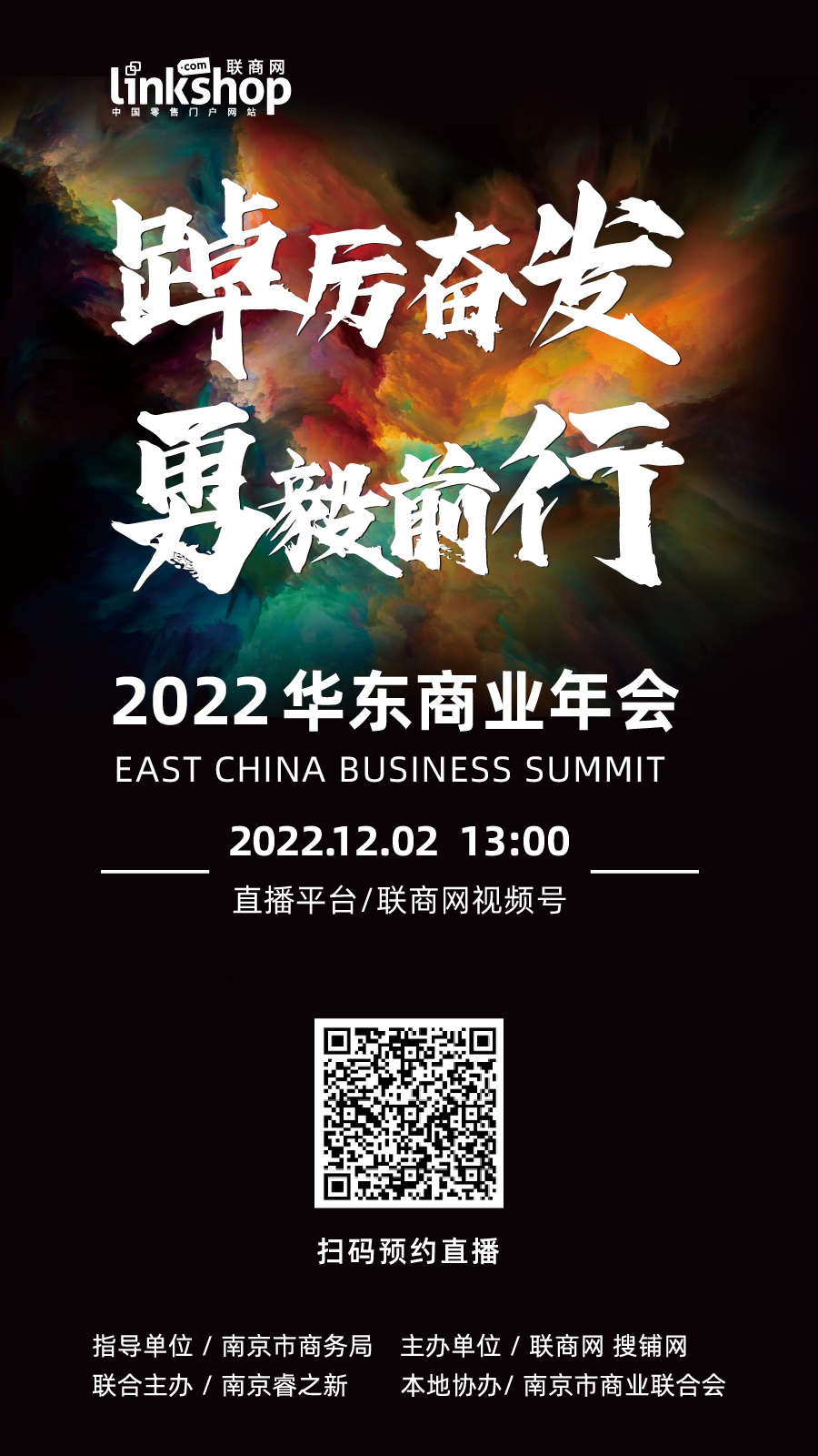 12月2日,由南京市商務(wù)局指導(dǎo),聯(lián)商網(wǎng)、搜鋪網(wǎng)主辦,南京睿之新聯(lián)合主辦的“2022華東商業(yè)年會(huì)”將以云直播形式舉行,屆時(shí),聯(lián)商網(wǎng)視頻號(hào)將進(jìn)行會(huì)議直播,換個(gè)方式見面,精彩依舊。會(huì)議以“踔厲奮發(fā)·勇毅前行”為主題,誠邀商業(yè)地產(chǎn)開發(fā)商、運(yùn)營商、購物中心、百貨店、品牌商、商業(yè)服務(wù)機(jī)構(gòu)及其他商業(yè)相關(guān)企業(yè)匯聚金陵,期待與您一起共同探討前行之路。