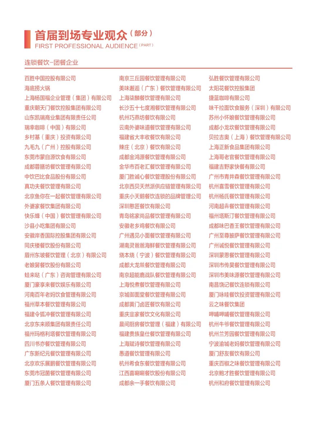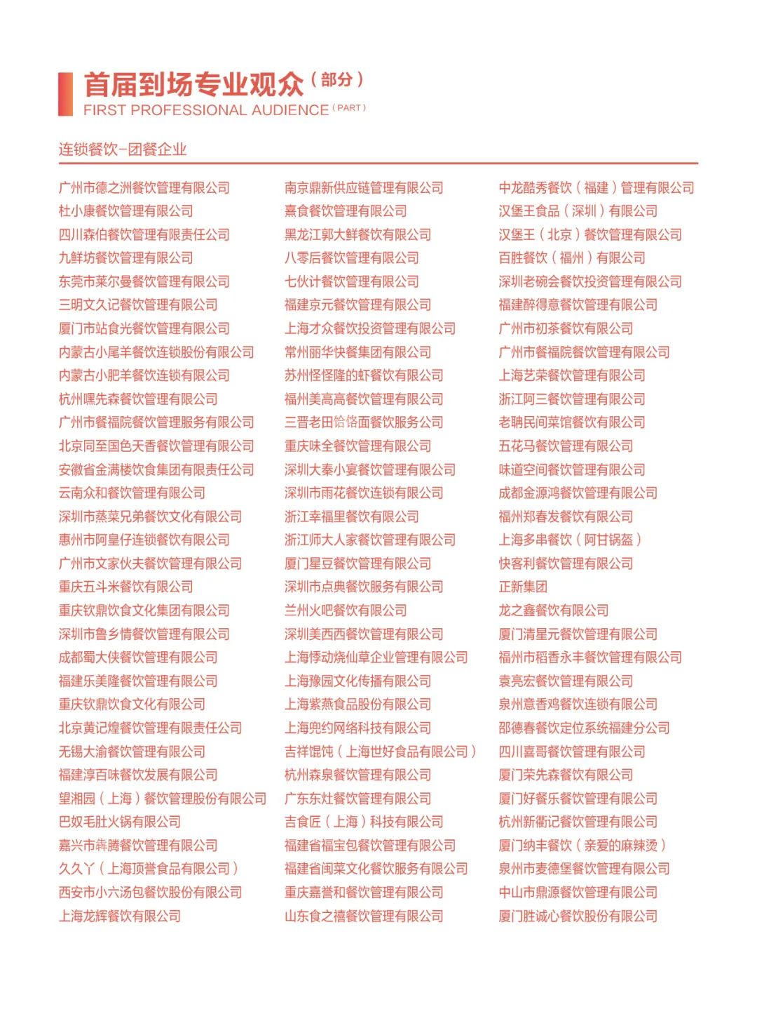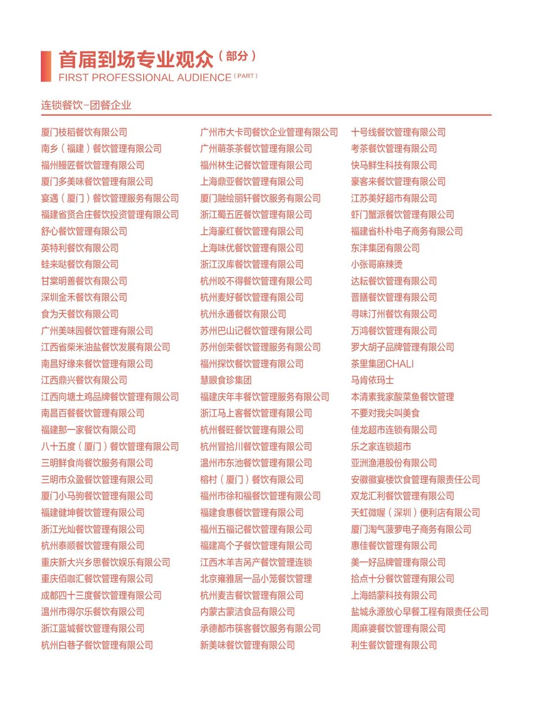 包括四川省第三產(chǎn)業(yè)協(xié)會、福建省正餐行業(yè)協(xié)會、江蘇省餐飲行業(yè)協(xié)會、江蘇省商業(yè)聯(lián)合會、蘇州市商業(yè)聯(lián)合會、無錫市商業(yè)聯(lián)合會、浙江省飯店業(yè)協(xié)會、廣東省餐飲服務(wù)行業(yè)協(xié)會、廣東省團餐配送行業(yè)協(xié)會、福建省連鎖經(jīng)營協(xié)會、福建省連鎖經(jīng)營協(xié)會供應(yīng)鏈分會、福建省旅游協(xié)會飯店分會、福建省漁業(yè)行業(yè)協(xié)會、福建省水產(chǎn)加工流通協(xié)會、福建省冷凍食品協(xié)會、福建省批發(fā)零售行業(yè)協(xié)會、福建省蔬菜供應(yīng)鏈協(xié)會、湖北省連銷經(jīng)營協(xié)會、安徽省連鎖經(jīng)營協(xié)會、陜西省連鎖經(jīng)營協(xié)會、大連市連鎖經(jīng)營協(xié)會、福州市餐飲烹飪行業(yè)協(xié)會、重慶市烹任協(xié)會、重慶市火鍋協(xié)會、東莞市連鎖餐飲發(fā)展促進會、東莞市團餐與配送行業(yè)協(xié)會、長沙市餐協(xié)、珠海市餐飲協(xié)會、蘇州市烹任協(xié)會、青島市食品工業(yè)協(xié)會、重慶市冷凍食品行業(yè)協(xié)會、廣州食品行業(yè)協(xié)會、邢臺市烹飪飯店協(xié)會、荷澤市食品安全促進會、福州市老字號協(xié)會、廈門餐飲茶飲同業(yè)公會、廈門餐飲走出去聯(lián)盟、福清市餐飲烹任行業(yè)協(xié)會、泉州市餐飲烹任行業(yè)協(xié)會、泉州市湘菜協(xié)會、晉江市餐飲烹任行業(yè)協(xié)會、石獅市餐飲烹任行業(yè)協(xié)會、莆田市餐飲烹飪行業(yè)協(xié)會、長泰區(qū)餐飲協(xié)會、南平市烹飪行業(yè)協(xié)會、三明市食品行業(yè)協(xié)會。