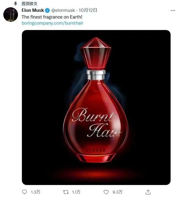 近日,馬斯克在個人社交平臺上發(fā)布一款名為“燒焦頭發(fā)(Burnt Hair)”的香水,由旗下無聊公司(Boring Company)推出。據(jù)悉,該香水每瓶售價為100美元,預(yù)售短短2小時內(nèi)就已賣掉1萬瓶,賺進(jìn)約100萬美元,將于2023年第一季度開始發(fā)貨。