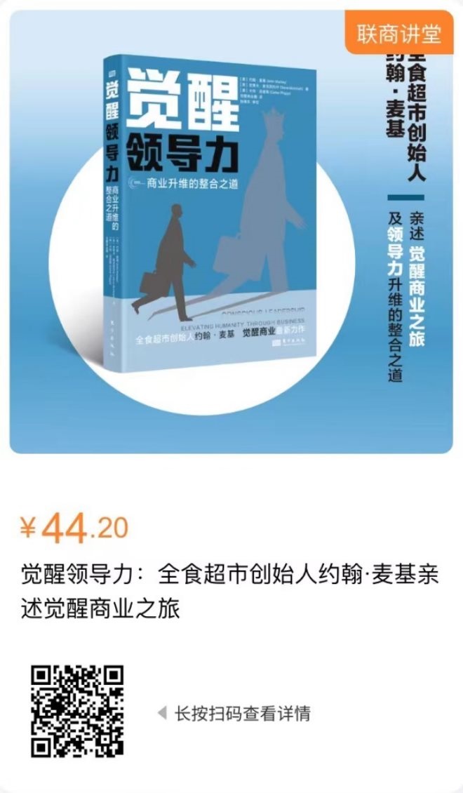 最后,為更好的回饋讀者,聯(lián)商書城新書首發(fā),正版好書特價回饋,原價68元的《覺醒領(lǐng)導(dǎo)力:全食超市創(chuàng)始人約翰·麥基親述覺醒商業(yè)之旅》現(xiàn)65折以44.20元出售,零售之路一起進階,識別圖中二維碼即可立即購買。