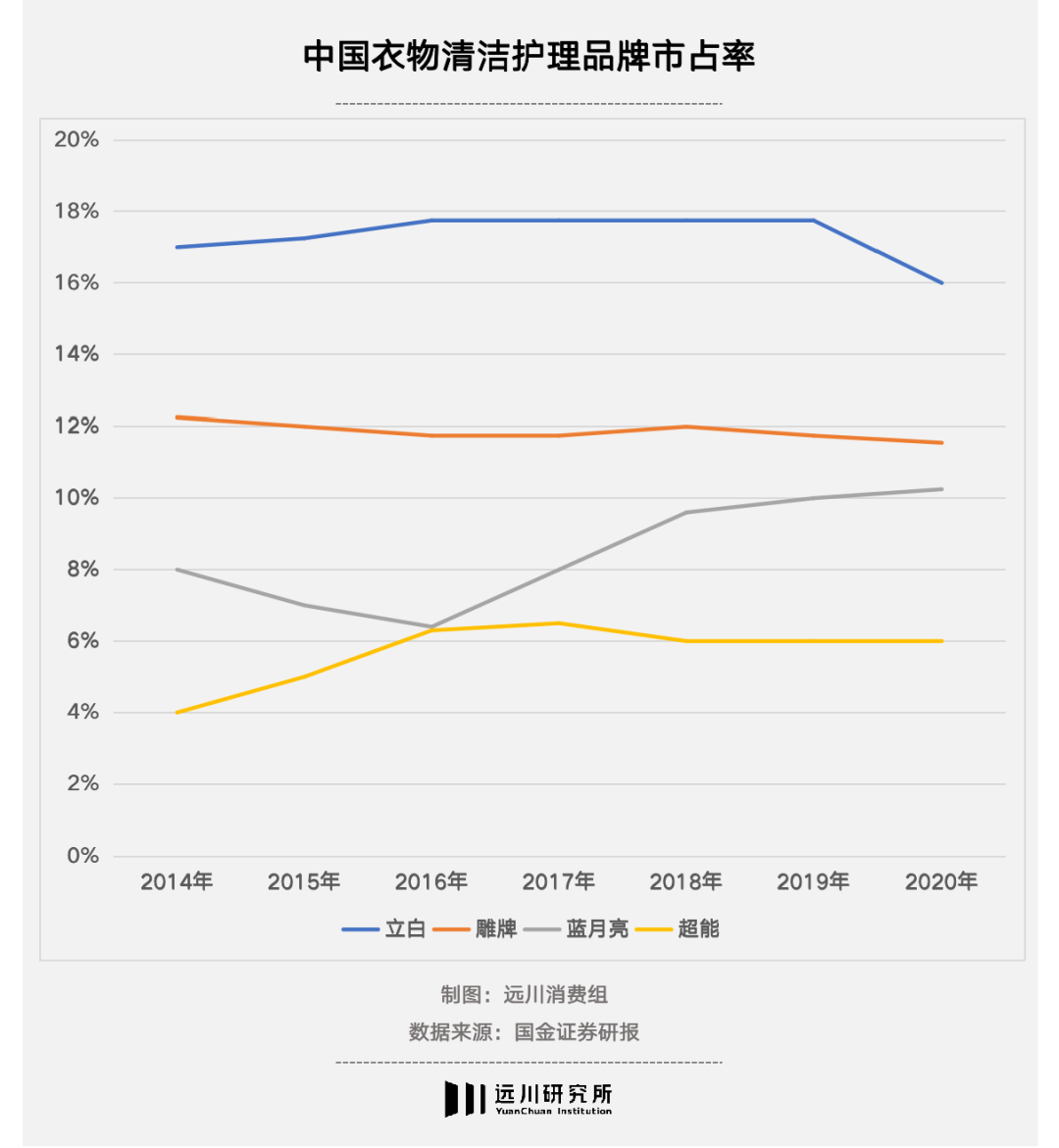 不重視貨架的藍(lán)月亮的市占率達(dá)到歷史低點(diǎn)6.4%。2016年,納愛斯旗下的超能洗衣液勢頭兇猛,趕上了藍(lán)月亮。