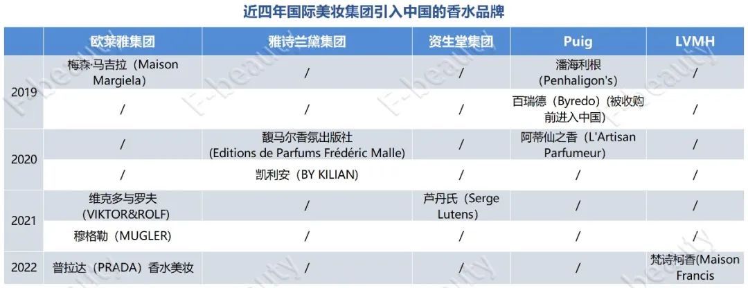 近3年來,各大化妝品集團大力打造香水品牌矩陣并加速將品牌引入中國市場。2019年,歐萊雅旗下Maison Margiela、Puig旗下潘海利根進入中國市場;2020年,雅詩蘭黛集團將馥馬爾香氛出版社、凱利安兩大高端香水引入中國。Puig集團則帶來阿蒂仙之香;2021年,資生堂集團旗下蘆丹氏進入中國。歐萊雅集團將MUGLER穆格勒、Viktor & Rolf維果羅夫也被相繼引入。