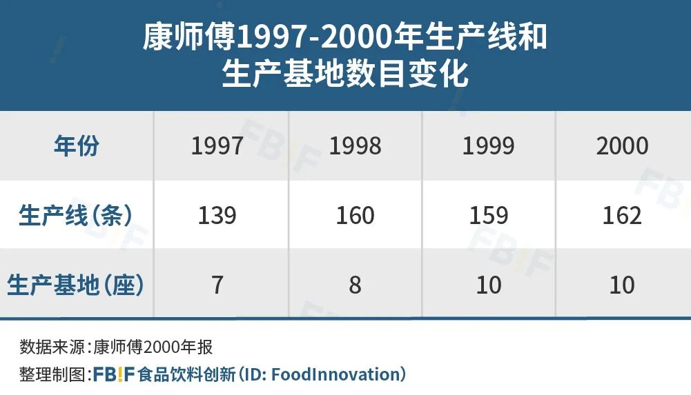 1997-2000年,康師傅將生產(chǎn)基地從7座增加到10座,生產(chǎn)線從139條擴充到162條。
