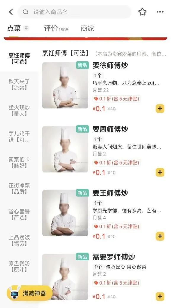 打開(kāi)手機(jī)外賣(mài)平臺(tái),在一家老牌餐館的頁(yè)面上,炒菜師傅身著廚師服、頭戴廚師帽的照片,配著廚師們的自薦語(yǔ),也出現(xiàn)在了點(diǎn)菜選項(xiàng)中。
