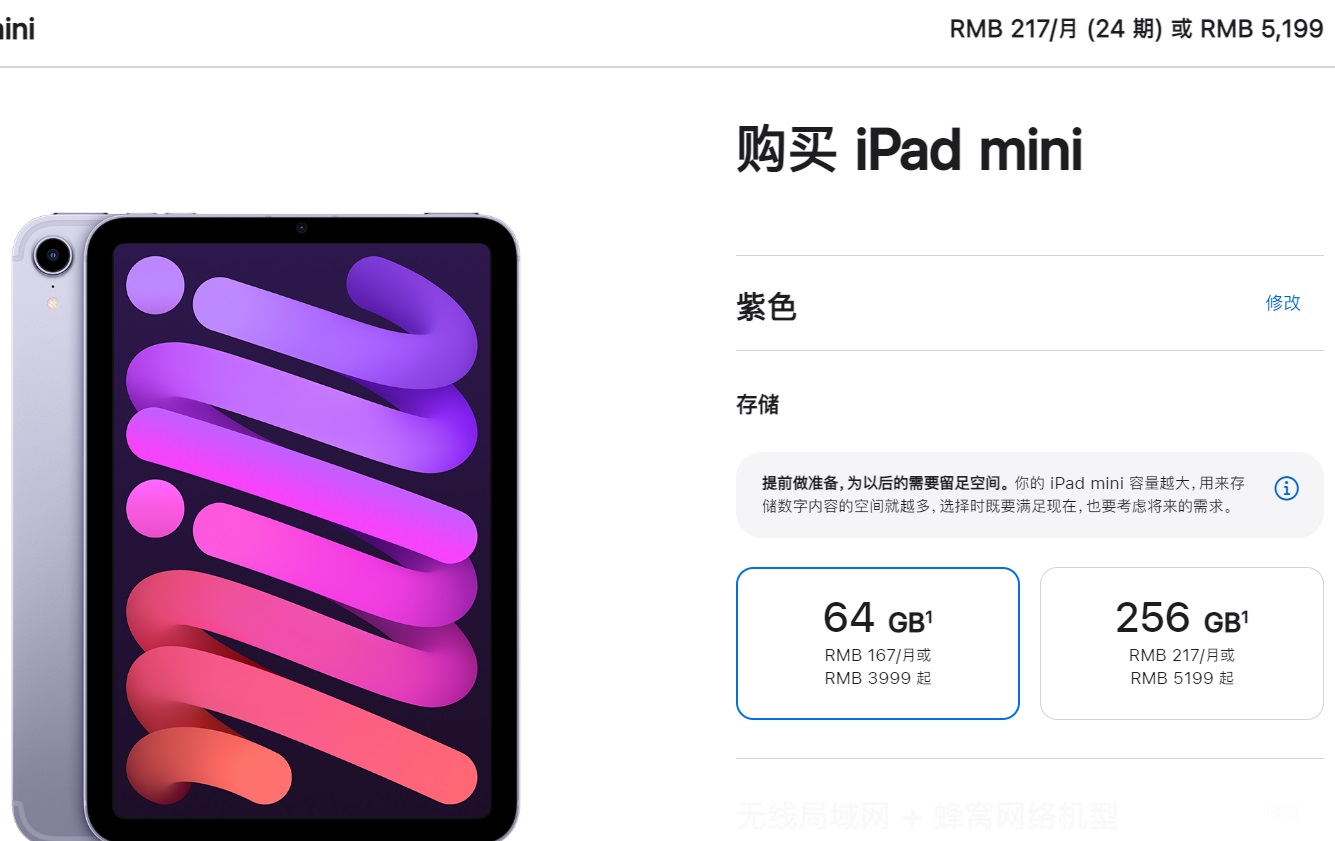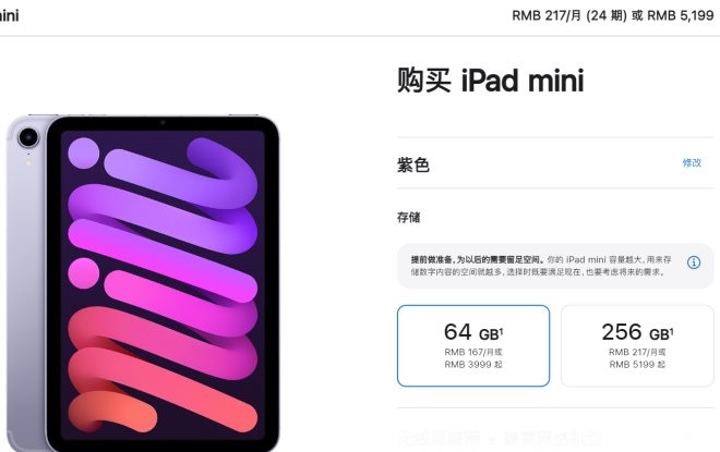 價(jià)格上調(diào)后的iPad mini6 圖源:蘋果官網(wǎng)截圖