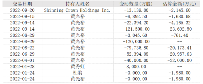 2022年來(lái),黃光裕夫婦對(duì)國(guó)美零售股權(quán)拋售情況;36氪根據(jù)Wind數(shù)據(jù)制表