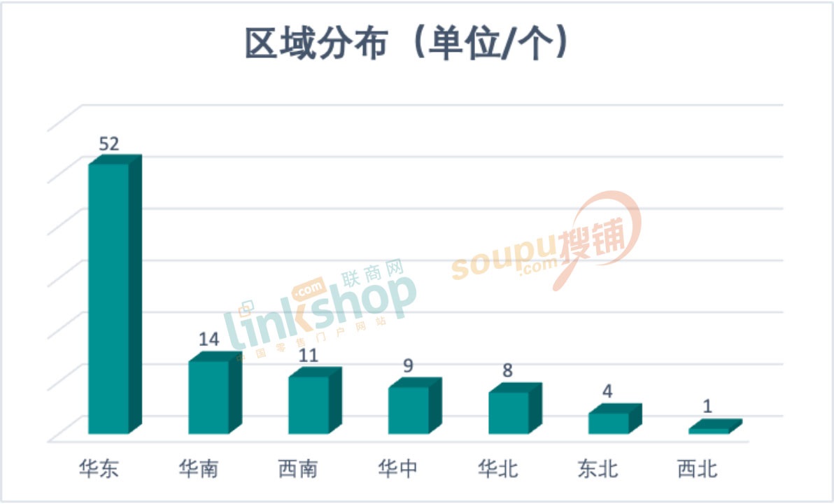 區(qū)域上看,華東、華南、西南三區(qū)占據(jù)前三,其中華東以52個(gè)開業(yè)量,超半數(shù)領(lǐng)跑。其他區(qū)域華中、華北、東北和西北緊隨其后。