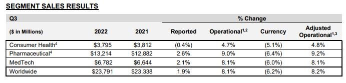 對于這份看起來還不錯的成績單,強(qiáng)生CEO Joaquin Duato表達(dá)了強(qiáng)烈的信心:“第三季度的業(yè)績顯示了我們在全部三個業(yè)務(wù)領(lǐng)域的持續(xù)實(shí)力和韌性。通過全球團(tuán)隊(duì)的持續(xù)努力,我們繼續(xù)在動態(tài)的宏觀經(jīng)濟(jì)環(huán)境中航行,并繼續(xù)專注于提供變革性的醫(yī)療保健解決方案。展望未來,我對我們的業(yè)務(wù)和能力保持信心,繼續(xù)推進(jìn)創(chuàng)新投資組合和渠道”。