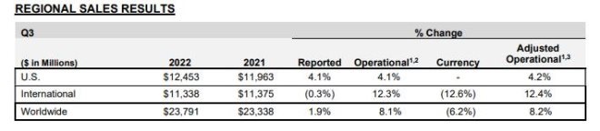 按地區(qū)劃分,強(qiáng)生Q3在美國銷售額為124.53億美元(約899.16億元人民幣),占比超過全球總銷售額的一半,同比增長4.1%。