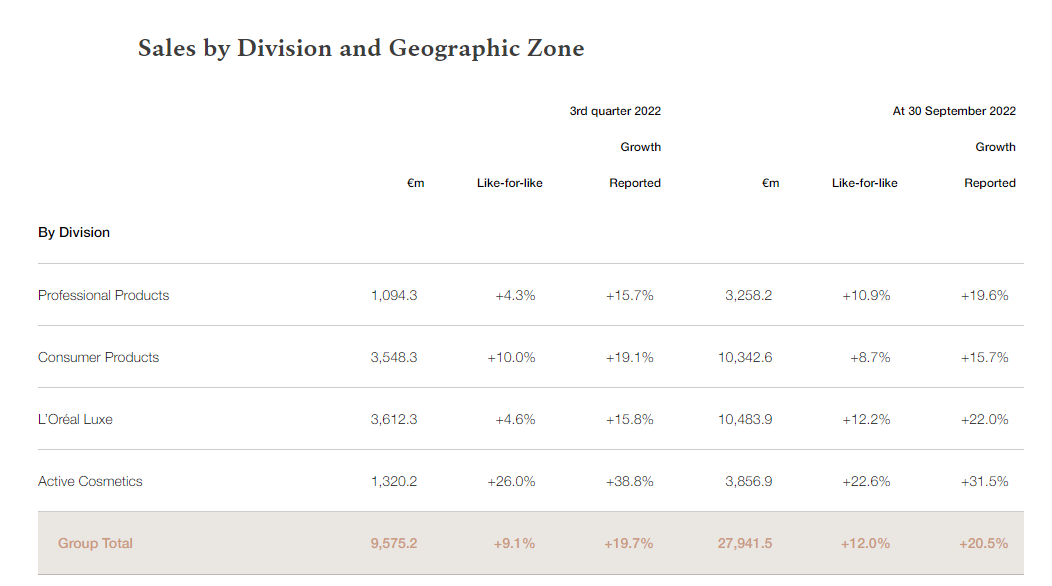 10月21日,歐萊雅集團(tuán)發(fā)布了2022年第三季度財(cái)報(bào),顯示截至2022年9月30日,歐萊雅前三季度實(shí)現(xiàn)279.4億歐元(約合人民幣1977.42億元)的銷(xiāo)售額,基于報(bào)告數(shù)字增長(zhǎng)20.5%,同比增長(zhǎng)12.0%。