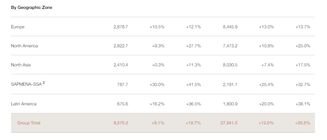 從各個(gè)地區(qū)來(lái)看,報(bào)告顯示,在2022年的第三季度中,歐萊雅集團(tuán)在其五大地區(qū)——?dú)W洲、北美洲、北亞、拉丁美洲以及SAPMENA-SSA5(包括南亞太、中東、北非和撒哈拉以南的非洲地區(qū)),均實(shí)現(xiàn)了增長(zhǎng)。