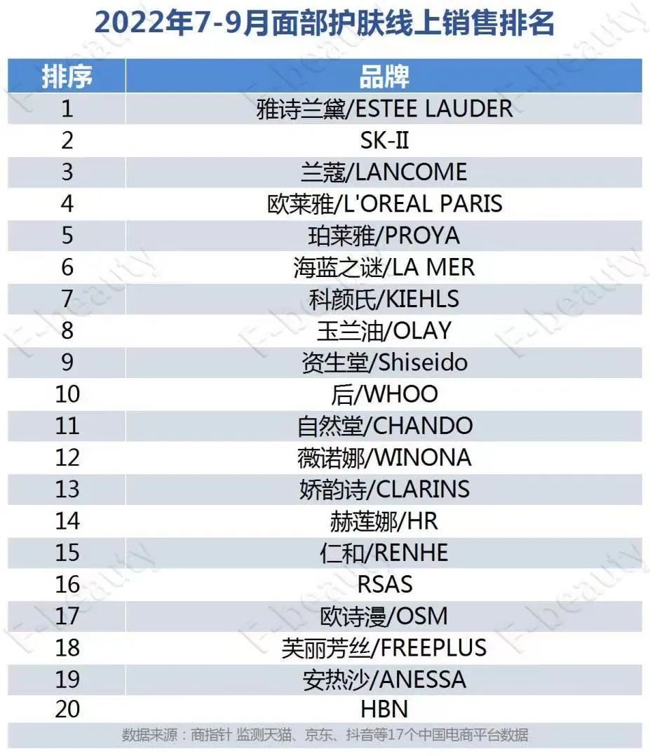 從商指針監(jiān)測(cè)的17個(gè)電商平臺(tái)2022年7-9月面部護(hù)膚線(xiàn)上銷(xiāo)售數(shù)據(jù)看,歐萊雅集團(tuán)旗下蘭蔻、科顏氏、赫蓮娜分別占據(jù)榜單第3名、第7名、第14名的位置。