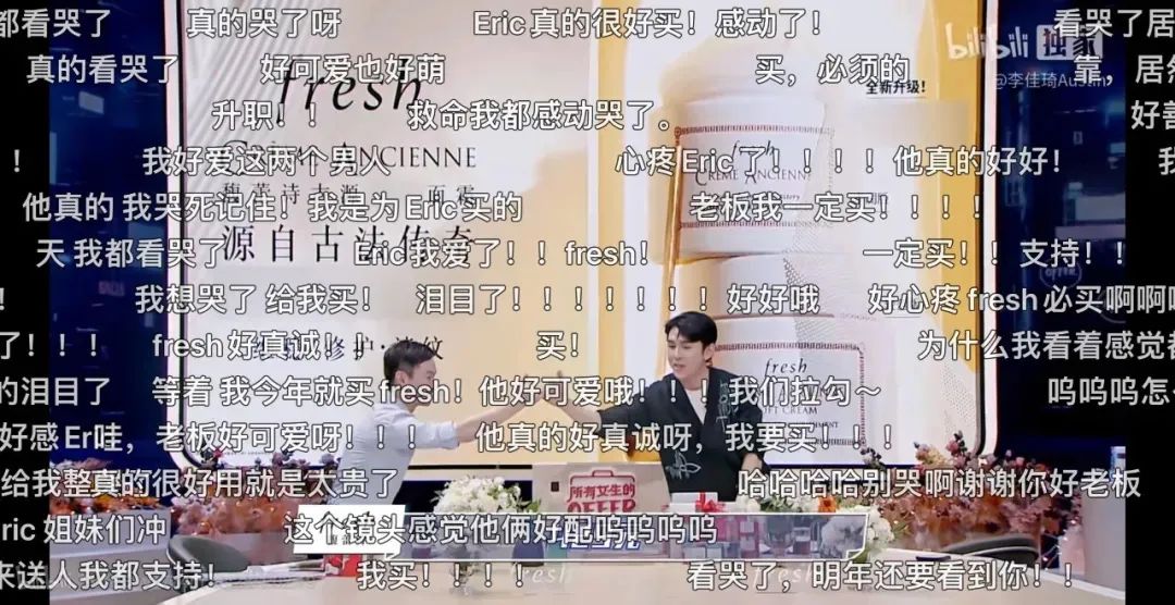 在李佳琦迅猛的價格“攻擊”下,F(xiàn)resh負責人Eric手足無措、泫然欲泣。在這一刻,冷靜按著計算器的消費者們,突然清醒地沉淪,彈幕內(nèi)容空前一致:“李佳琦,對Eric好一點!”“別壓他10塊錢了!我買還不行嘛!”“為了Eric沖!”
