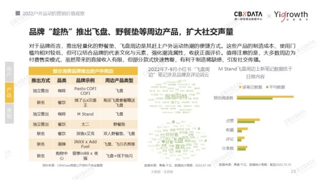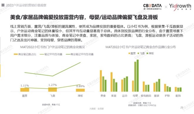 線上營銷方面,抖音、小紅書、淘寶、京東等平臺均推出戶外相關(guān)營銷IP,打造內(nèi)容生產(chǎn)、達人變現(xiàn)、品牌營銷的閉環(huán)。盡管戶外運動內(nèi)容的商業(yè)化還在初始階段,但已成為品牌內(nèi)容種草、直播帶貨的潛力場景。CBNData《報告》顯示,由于露營場景下用戶需求細分、注重品質(zhì)與體驗,商業(yè)筆記中美食、家居、家電數(shù)碼的占比更高;飛盤、滑板運動是親子活動的熱門之選及出片神器,受到母嬰、穿搭品牌的青睞。在品牌開展的戶外主題場景自播中,品牌聲量、轉(zhuǎn)化效果均有提升,用戶甚至會在汽車品牌的露營主題直播間購買汽車訂金類產(chǎn)品。