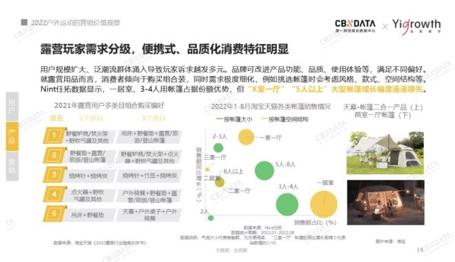 其次從產(chǎn)品看,玩家需求極度細分,同時在產(chǎn)品功能之外,衍生出顏值、潮流等附加需求。以露營帳篷為例,根據(jù)CBNData《報告》顯示,一居室、3-4人用帳篷的消費規(guī)模占據(jù)主體,但近年來玩家對體驗、品質(zhì)的要求不斷提升,同時群體出游趨勢明顯,因此“X室一廳”“5人以上”的大型帳篷增幅更為迅猛。此外,露營玩家分化為精致露營、便攜露營、BC露營等不同派別,其購買偏好、產(chǎn)品需求也存在區(qū)別。
