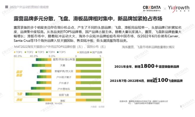 最先受益的是相關(guān)裝備品牌。其中,露營裝備內(nèi)存在帳篷、營地車、天幕、戶外桌椅等多個明星類目,品牌多為跨類目布局,各自擁有相對優(yōu)勢的類目及明星單品;飛盤、滑板類目內(nèi),頭部品牌已經(jīng)積累下一定的專業(yè)性、知名度基礎(chǔ),品牌集中度較高。但近年來新玩家涌入戶外市場,新品牌看到入局時機,開始加緊搶占市場。