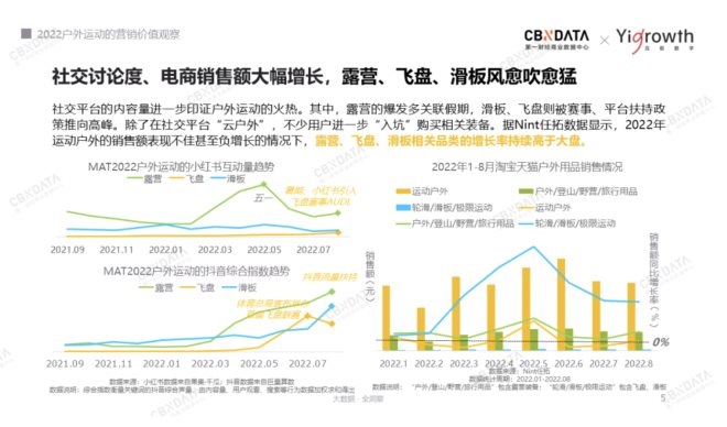 露營、飛盤、滑板運動的熱度之下,戶外品牌、大眾消費品牌分別如何將其轉(zhuǎn)化為品牌紅利?有哪些成功的案例及可復用的經(jīng)驗?10月21日,第一財經(jīng)商業(yè)數(shù)據(jù)中心(CBNData)聯(lián)合Yigrowth發(fā)布《2022戶外運動營銷價值報告》(以下簡稱CBNData《報告》,點擊閱讀原文查看完整版報告),基于戶外運動的內(nèi)容熱度、銷售數(shù)據(jù),分別拆解戶外品牌、大眾消費品牌與戶外運動的結(jié)合方式,分析戶外運動在用戶端、產(chǎn)品端、渠道端的多維營銷價值。