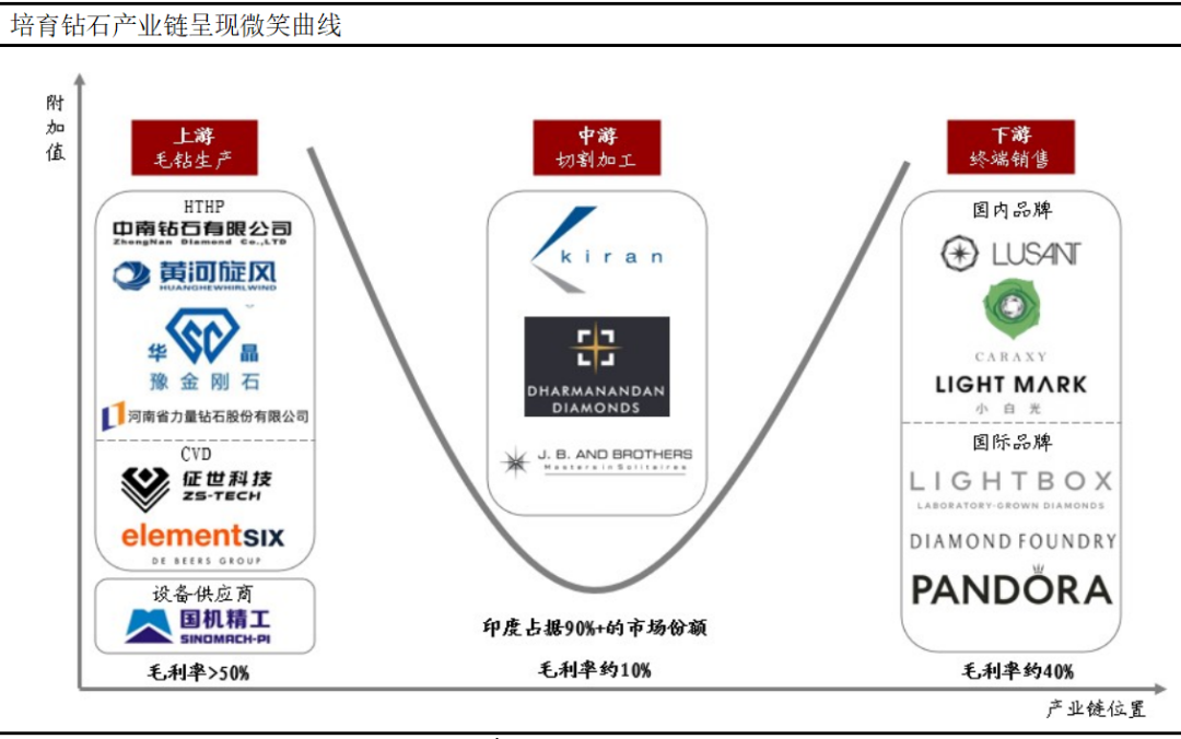 中國(guó)、印度、美國(guó)分別主導(dǎo)培育鉆石生產(chǎn)、加工、零售市場(chǎng),產(chǎn)業(yè)鏈呈現(xiàn)微笑曲線形態(tài)。有數(shù)據(jù)顯示,上游天然及培育鉆石生產(chǎn)毛利率超過(guò)50%,中游加工依賴大量人力,毛利率約10%,下游零售品牌溢價(jià)加成毛利率約40%。