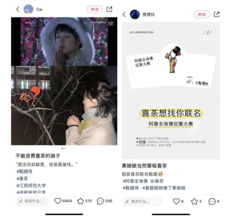 作為《甄嬛傳》首個(gè)聯(lián)名的新茶飲品牌,喜茶同樣善于激發(fā)網(wǎng)友二創(chuàng)熱情,喜茶logo變裝、喜茶聯(lián)名包材二創(chuàng)等話題曾一度沖上熱搜,圍繞喜茶產(chǎn)品的復(fù)刻更是小紅書、抖音、B站等平臺(tái)的熱門內(nèi)容。粉絲圍繞雙方IP所進(jìn)行的聯(lián)動(dòng)二創(chuàng),直接啟發(fā)了喜茶對(duì)于本次跨界合作的靈感。
