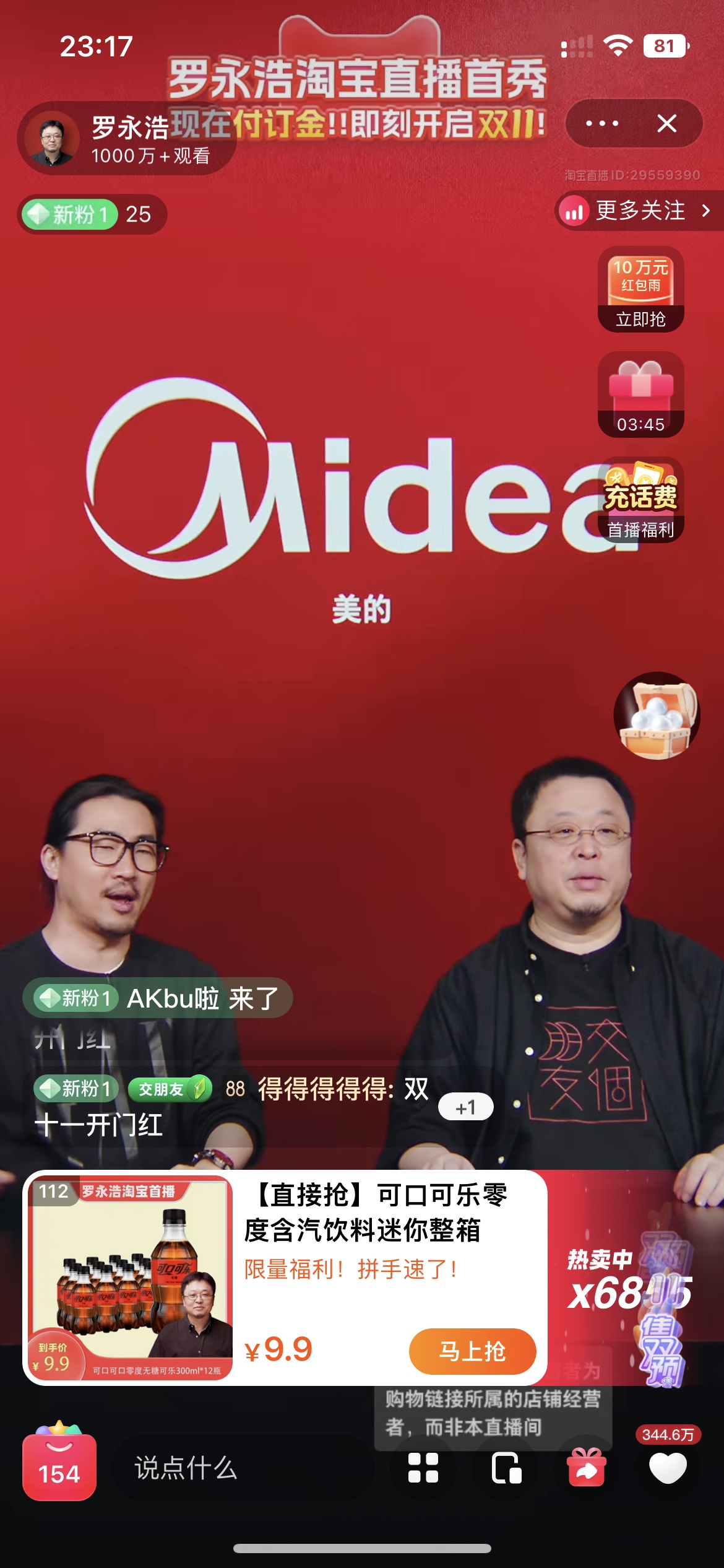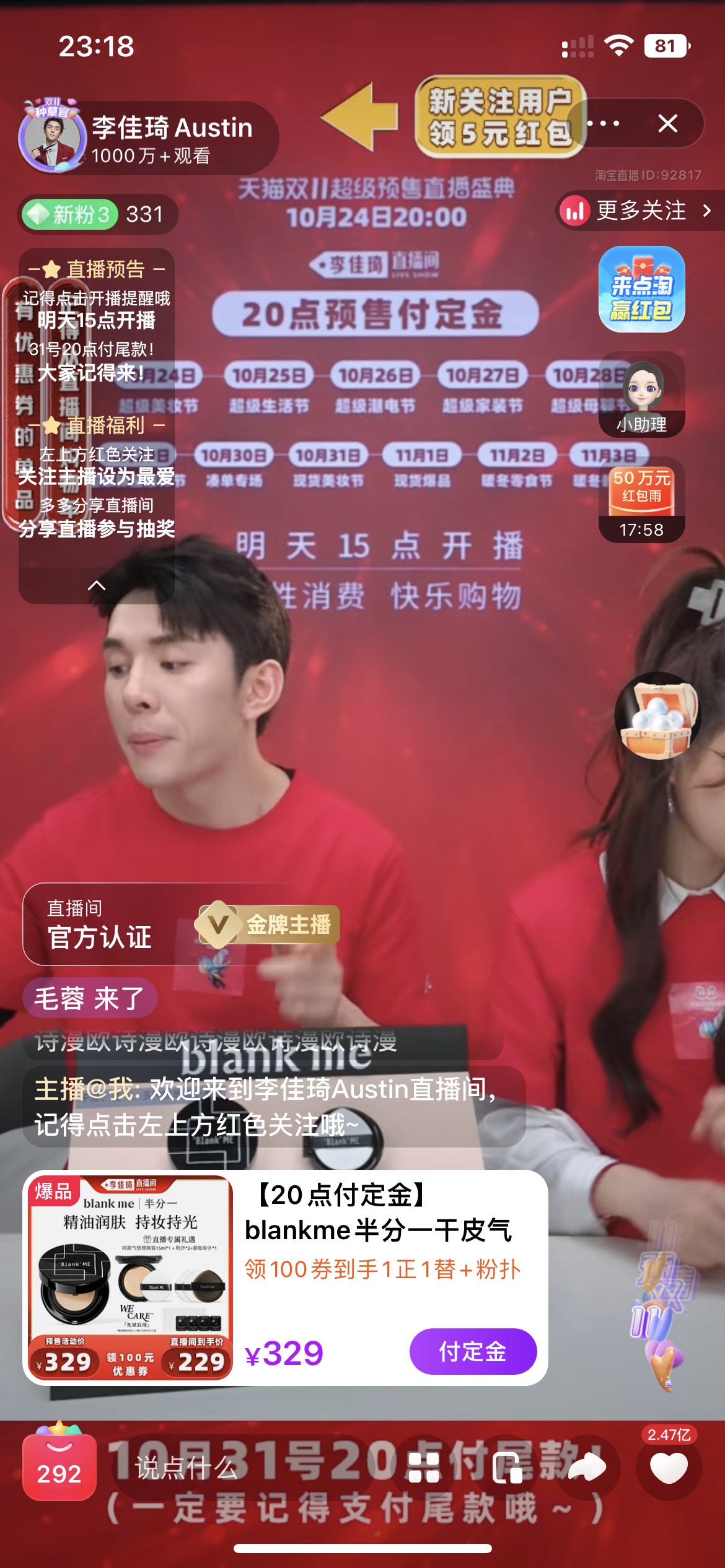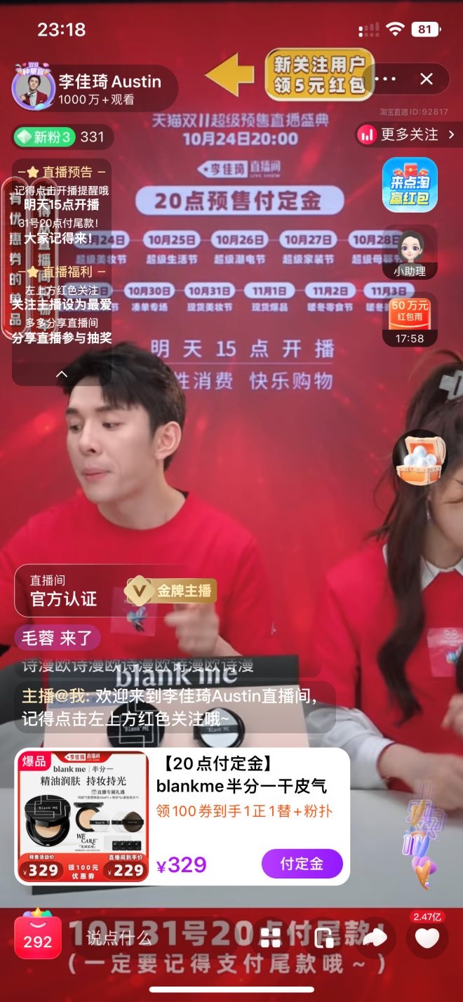 李佳琦于10月24日15點(diǎn)開始預(yù)熱開播,羅永浩晚了3小時(shí),于18點(diǎn)開始。
