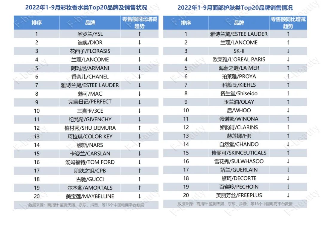 2022年1-9月面部護(hù)膚TOP20的品牌中,近五成品牌的銷(xiāo)售額同比下滑,彩妝香水品類(lèi)Top20中則有14個(gè)品牌的零售額同比呈下滑狀態(tài)。