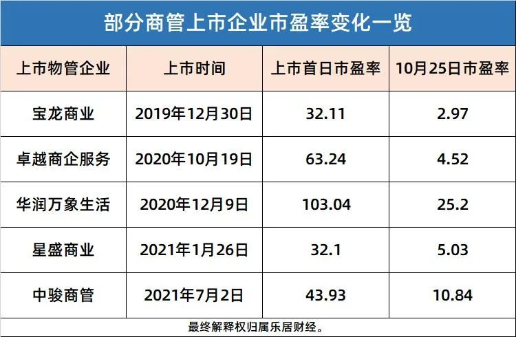 自2021年下半年以來,物業(yè)股市盈率經(jīng)歷較大滑落。比如,商管平臺(tái)龍頭華潤萬象生活從上市首日的103倍,下降至目前的25倍;卓越商企服務(wù)從上市首日的63倍,下降至目前的4.5倍。寶龍商業(yè)、星盛商業(yè)、中駿商管等均有較大幅度下滑。