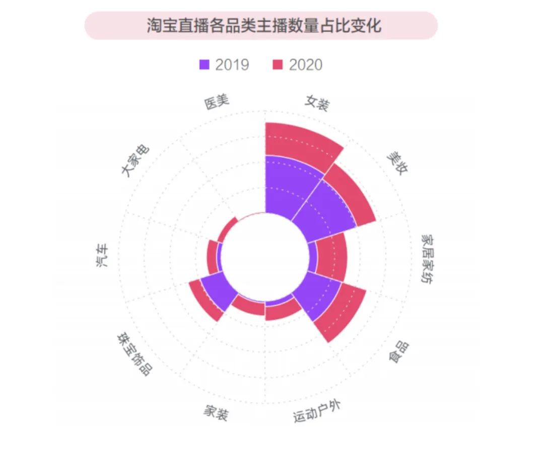 而3C數(shù)碼背后的男性消費卻是淘寶有意補足的短板。根據(jù)淘榜單聯(lián)合淘寶直播ON MAP推出的《淘寶直播2021年度報告》顯示,淘寶直播中,服飾主播和美妝主播數(shù)量最多,2019年兩者占比分別為14%和12.9%。到了2020年,在這兩個類目的主播數(shù)量倍數(shù)增長。這與淘寶直播以女性用戶為主相關(guān),淘寶直播的主要用戶是80、90后女性。