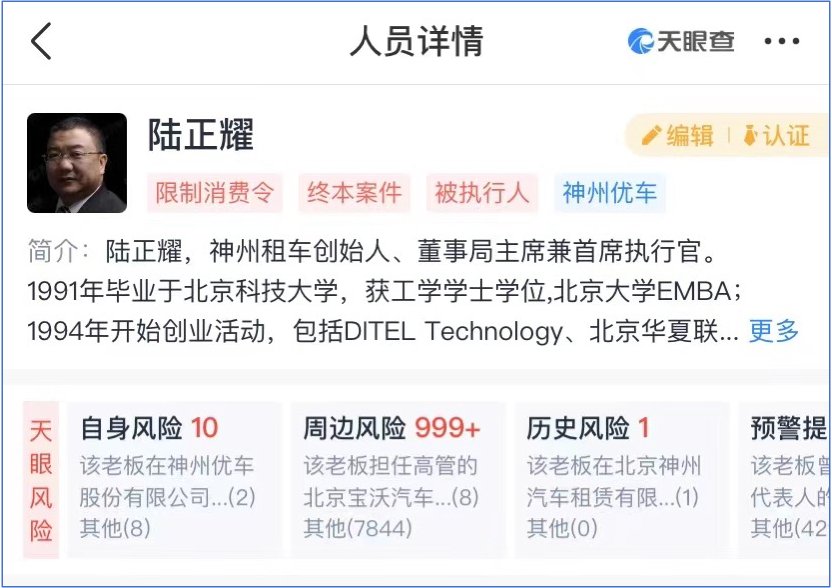 在天眼查APP上搜索“陸正耀”,其風(fēng)險(xiǎn)提示高達(dá)7000余條,其中“自身風(fēng)險(xiǎn)”10條,包括金融借款合同糾紛、股權(quán)凍結(jié)信息等。陸正耀本人被法院列為“被執(zhí)行人”,并伴隨“限制消費(fèi)令”。