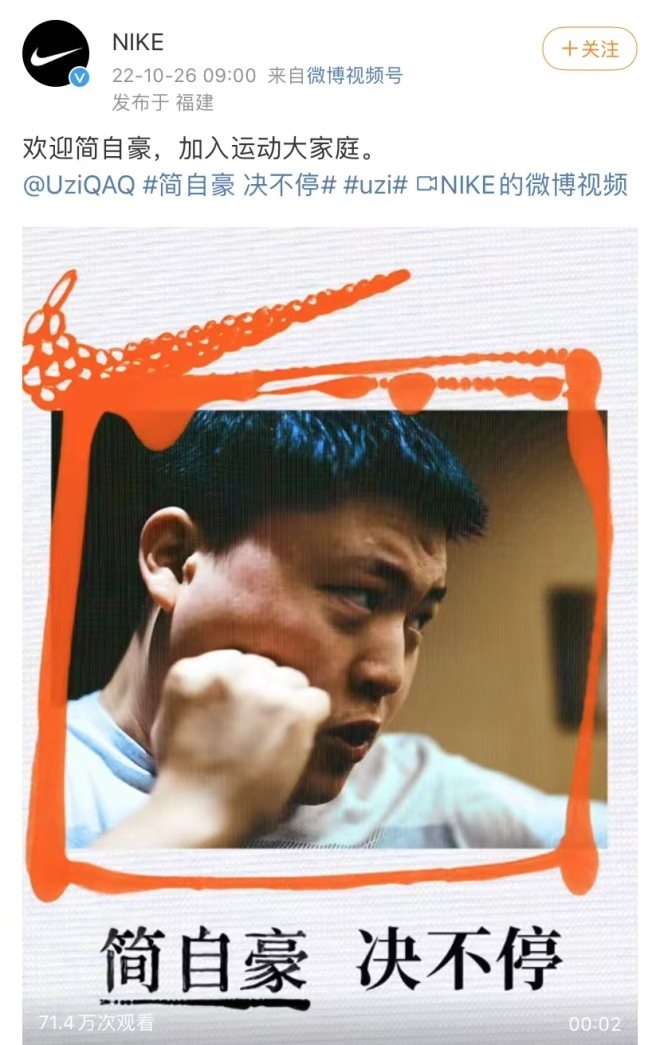 10月26日,耐克在其官方微博發(fā)文宣布電競運動員Uzi簡自豪加入耐克大家庭,這是耐克旗下在世界范圍內(nèi)首位電競運動員。