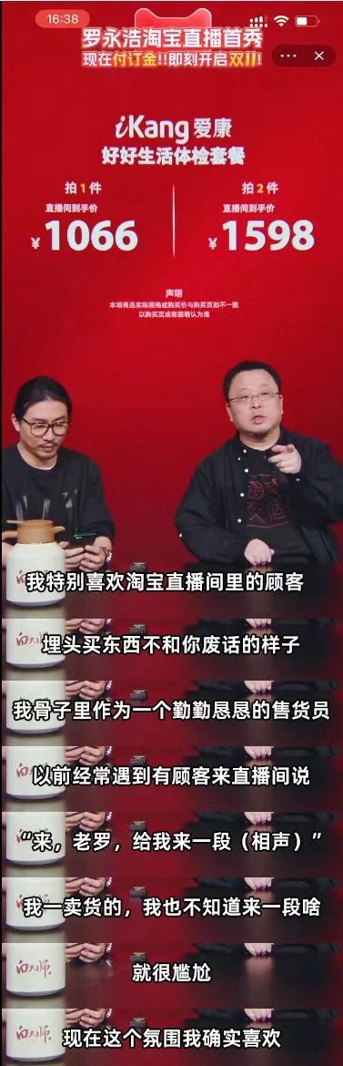“氣氛對了,我就喜歡這邊的氣氛,大家也不說話,就埋頭買東西,我就想做一個認真賣貨的售貨員”,天貓雙11預(yù)售直播首秀時,羅永浩在直播間如此調(diào)侃。