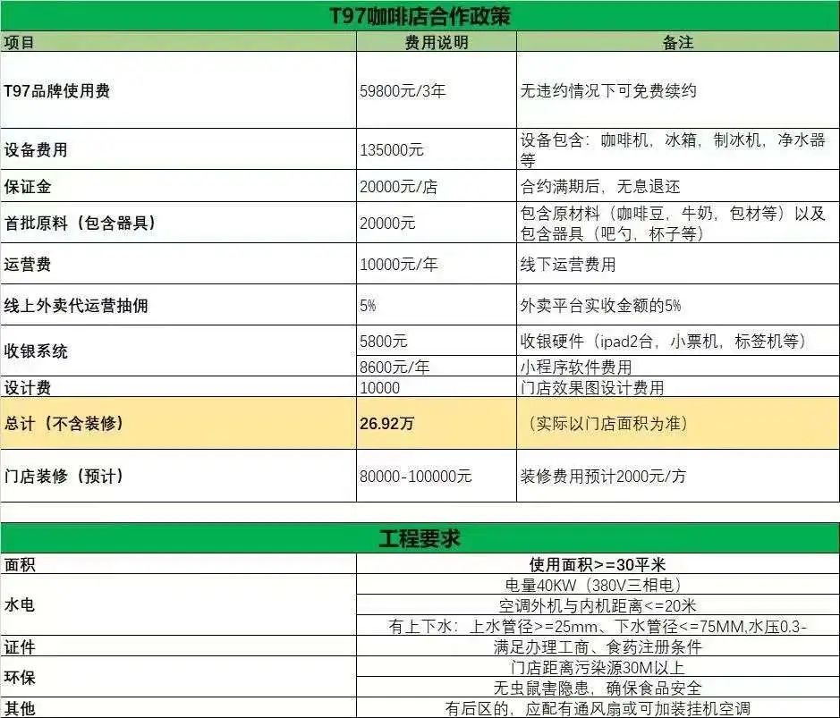 圖注:T97咖啡加盟費(fèi)用明細(xì)。
