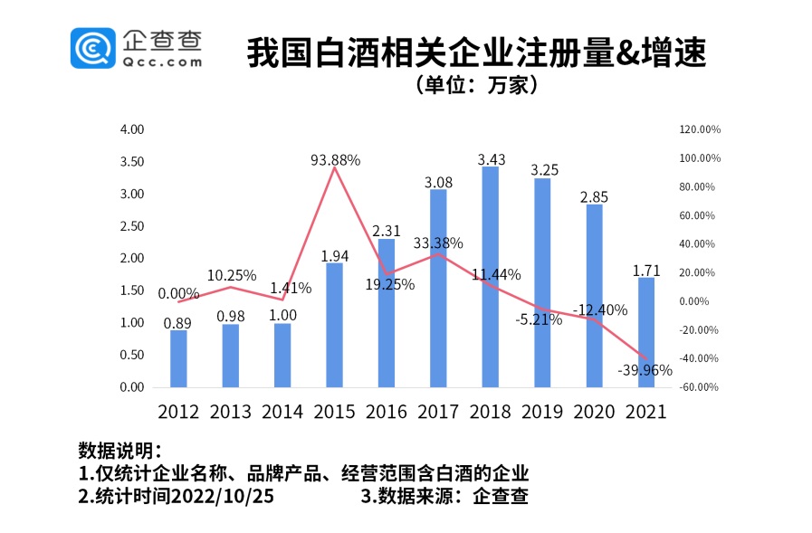 據(jù)企查查數(shù)據(jù)顯示,我國現(xiàn)存白酒相關企業(yè)超19萬家。2022年上半年,我國新增白酒相關企業(yè)4776家,同比減少45.26%。2019年我國新增白酒相關企業(yè)3.25萬家,同比減少5.21%。2020年新增2.85萬家,同比減少12.40%。2021年新增1.71萬家,同比減39.96%。