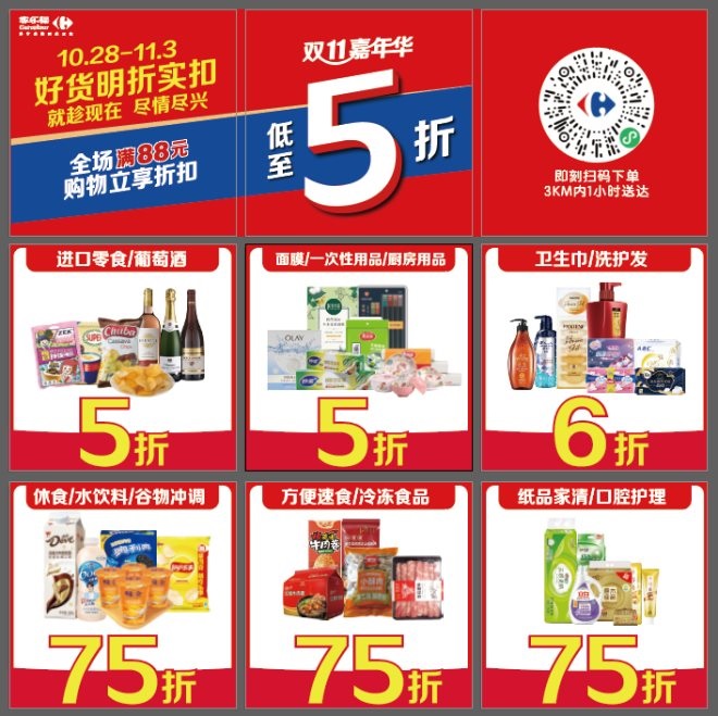 在進(jìn)店萬圣節(jié)打卡之外,疊加家樂福雙11活動(dòng),購(gòu)物還可享受全場(chǎng)爆款五折、愛購(gòu)上海消費(fèi)券疊加滿減、等明折實(shí)扣福利。