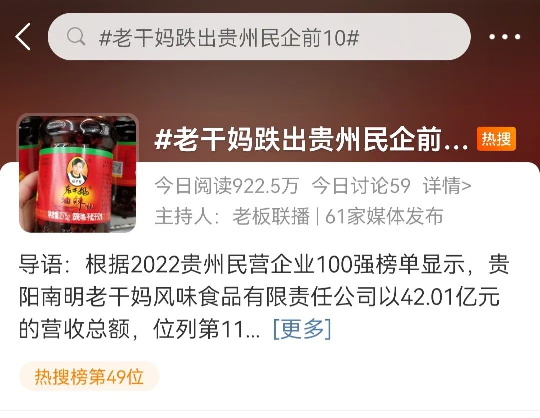老干媽,這個低調(diào)又充滿傳奇色彩的名字,在10月25日再次登上了熱搜,相比于上次熱搜令人啼笑皆非的騰訊“逗鵝冤”事件,老干媽這次的處境并不算好:2022貴州民營企業(yè)100強名單上,老干媽營收下滑12億元,跌出前10名。
