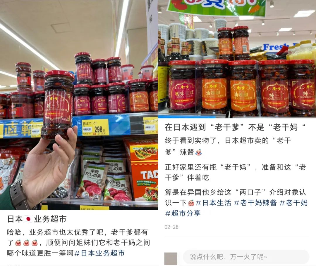 在日本留學的小林向「電商在線」表示,在日本的業(yè)務(wù)超市里,國民男神老干爹已經(jīng)打敗了國民女神老干媽:“業(yè)務(wù)超市主打優(yōu)惠,之前是對大量批發(fā)做業(yè)務(wù)的人開放,現(xiàn)在也向普通消費者開放了,不少留學生也會逛。之前有段時間,業(yè)務(wù)超市還只賣老干爹!