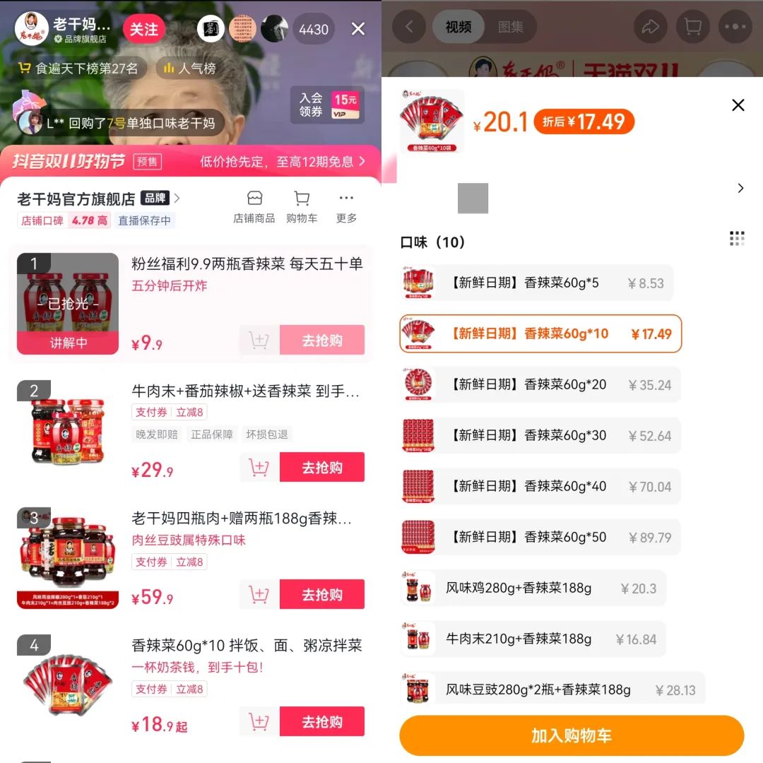 2018年4月,老干媽天貓旗艦店正式營業(yè),2020年,老干媽又開設(shè)了抖音賬號和微信的“陶奶奶會員店”小程序,但直到2021年,老干媽才在抖音帶貨。