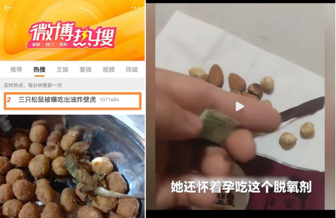 年中,《市場監(jiān)管總局關于20批次食品抽檢不合格情況的通告》顯示,三只松鼠開口松子相關指標不符合食品安全國家標準規(guī)定。年末,消費者投訴三只松鼠堅果發(fā)霉變質(zhì);甚至還有消費者表示,收到的零食禮包中有一只活倉鼠及排泄物。
