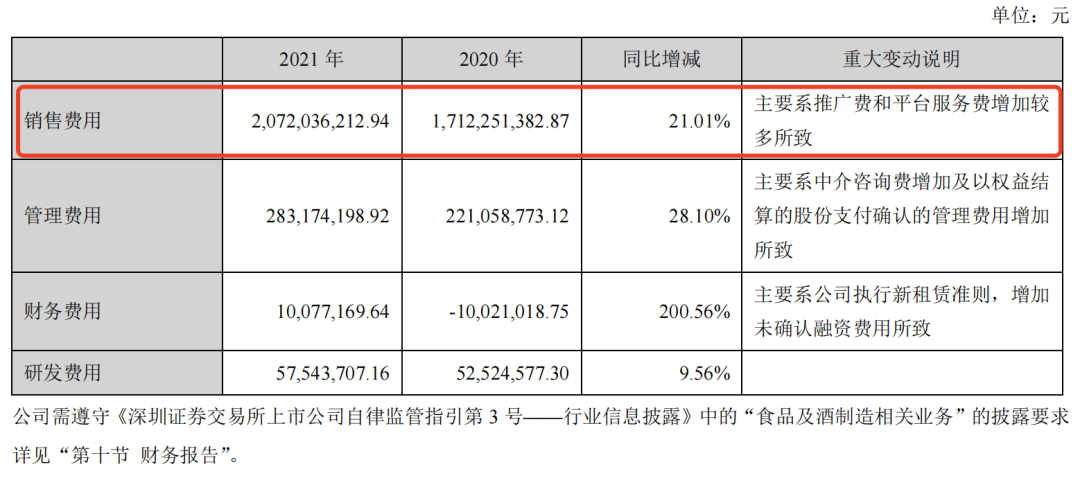 2016年至2021年間,三只松鼠銷售費用分別為9.178億、10.75億、14.61億、22.98億、17.12億元、20.72億元,占營收比例為20.75%、19.36%、20.87%、22.59%、17.48%、21.21%。