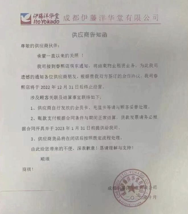 一份蓋有成都伊藤洋華堂有限公司公章的《供應(yīng)商告知函》顯示,接業(yè)主方通知,將結(jié)束物業(yè)租賃服務(wù),成都伊藤洋華堂春熙店將于今年12月31日后終止經(jīng)營(yíng)。對(duì)此,成都伊藤洋華堂方面對(duì)《聯(lián)商網(wǎng)》表示,消息屬實(shí),與利都廣場(chǎng)就續(xù)約問(wèn)題未達(dá)成一致。