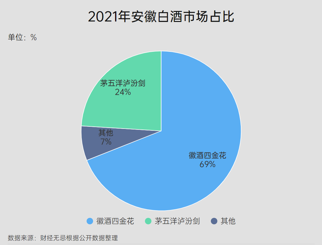 隨著安徽省消費(fèi)升級(jí)的不斷推進(jìn),根據(jù)行業(yè)數(shù)據(jù)統(tǒng)計(jì),2021年安徽白酒市場(chǎng)大約69%的份額被徽酒四金花占據(jù),以茅五洋瀘汾劍為代表的省外名酒占據(jù)了24%左右的份額。