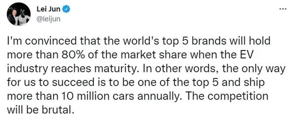 主營(yíng)業(yè)務(wù)遭遇瓶頸的同時(shí),“造車”被外界視為小米的紓困之計(jì)。近日,雷軍在社交媒體上表示,他相信,當(dāng)電動(dòng)汽車行業(yè)成熟時(shí),世界前五大品牌將占據(jù)80%以上的市場(chǎng)份額。他稱:“換句話說(shuō),我們成功的唯一途徑是成為前五名之一,并且每年出貨量超過(guò)1000萬(wàn)輛。競(jìng)爭(zhēng)將是殘酷的!